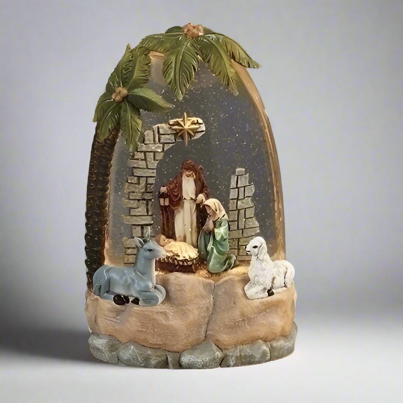 Lighted Holy Family W/ Palm Tree Snow Globe, 8.5