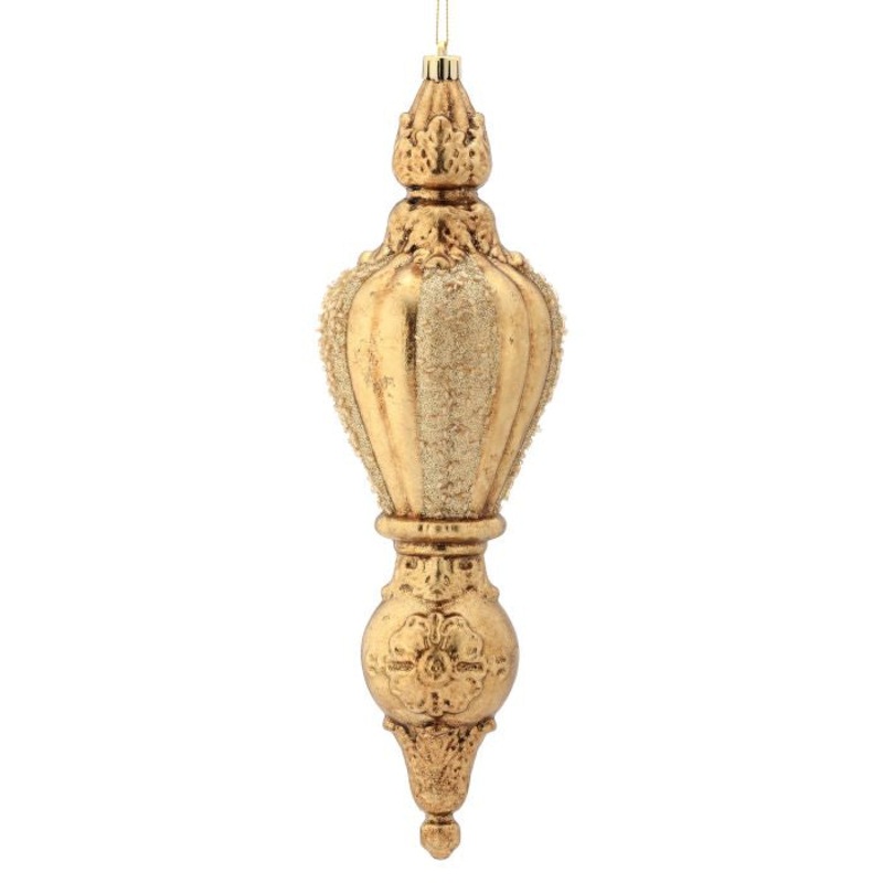 Transform your holiday display with these magnificent Antique Finial Ornaments. Standing tall at 12 inches, each ornament in this set of three features a timeless design enhanced with sparkling glitter that catches the light beautifully. The vintage-inspir