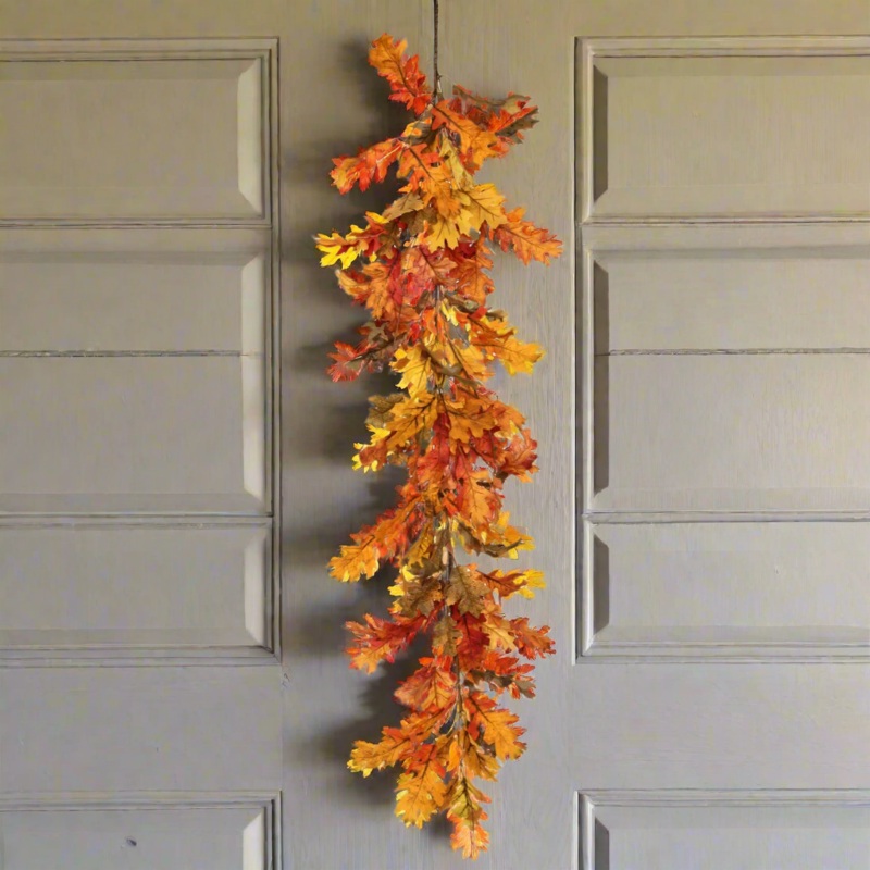 The "Autumn Harvest Bounty Oak Leaf Garland, 48"" showcases a beautiful array of vibrant fall colors with realistic oak leaves in shades of orange, yellow, and red. Perfect for draping over mantels, doorways, or banisters, this garland brings the warm, inv