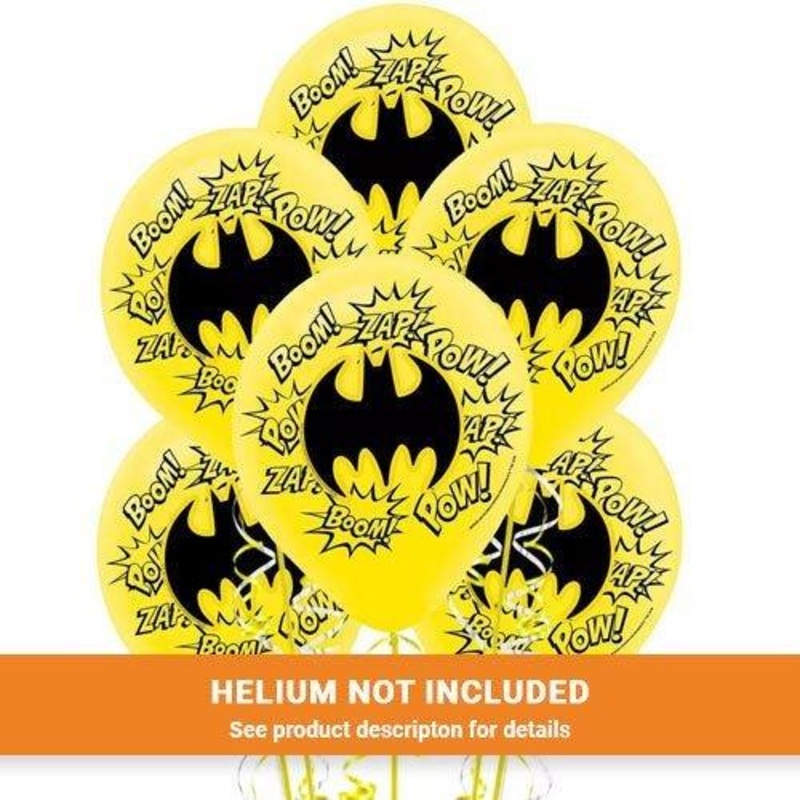 This Batman balloon decorating kit includes six yellow latex balloons with classic comic book phrases such as "Pow!" and "Boom!" Each balloon includes an attachable Batman logo. Add other balloons to create a balloon bouquet for your child's birthday party