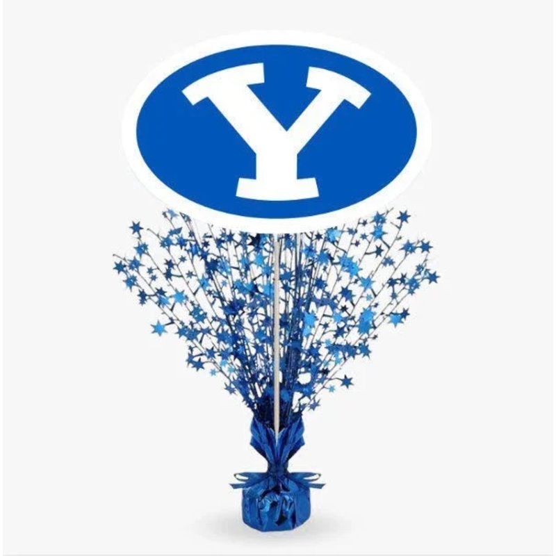 Transform your game-day setup with the BYU Stretch Y Centerpiece Spray, the ultimate table decoration for Cougars fans! This officially licensed Brigham Young University centerpiece showcases a vibrant navy and white design, featuring a bold 6.5″ Stretch Y logo atop a dazzling 13.5″ spray of blue metallic stars. Perfect for tailgates, watch parties, birthdays, graduations, or any BYU-themed celebration, this durable yet quirky accent adds a fun pop of color and team pride to your table. Shop now for fast shipping and unbeatable prices on this must-have BYU party essentialmake your decorations the talk of the event and cheer on the Cougars in style!”