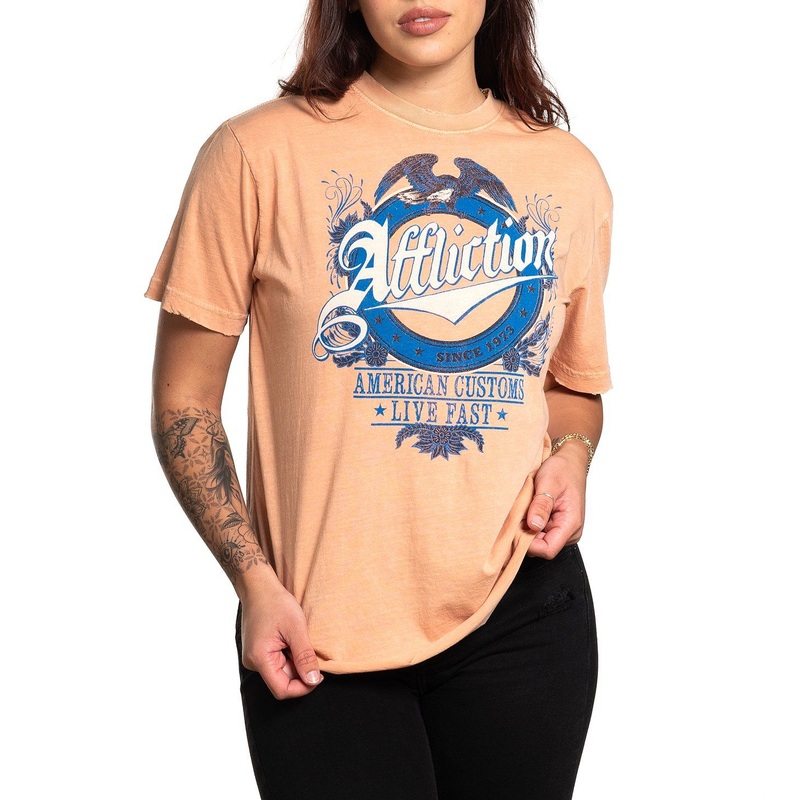 Affliction Women's Cascade Short Sleeve Crewneck Tee100% CottonSandstoneRaw HemModel is wearing size Small