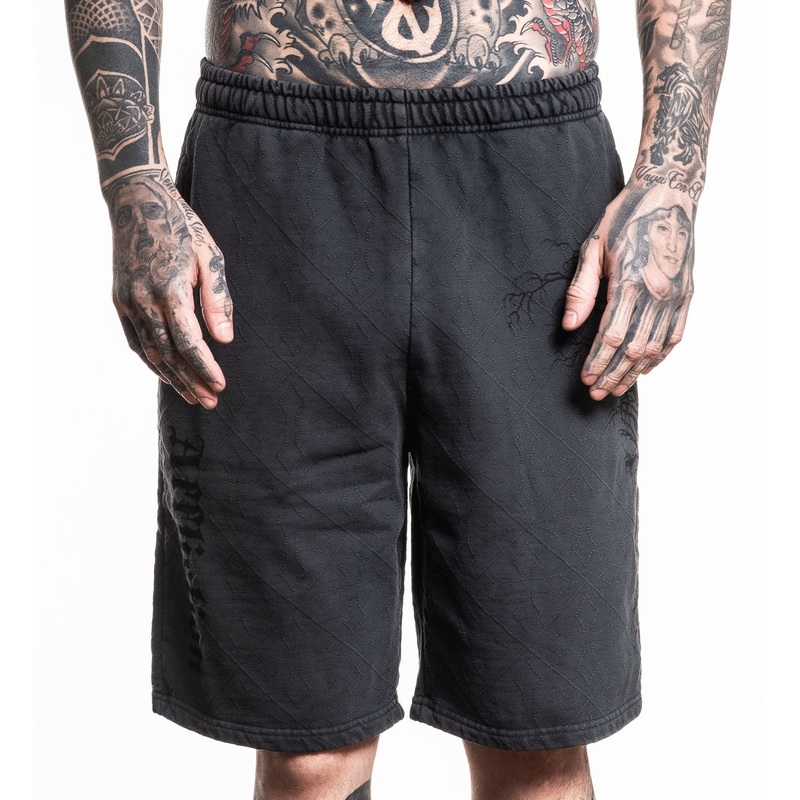 Affliction Mens Catharsis Short100% CottonCharcoal Lava WashRelaxed FitBlue + Black Lava TintBlack Raw Edge Jersey Patch Sewn On With Red 187c Zig ZagStitchRed Foil Hangtag + Internal LabelJacquard Cross Pattern - Pattern In FabricEach Piece is Uniquely Nu