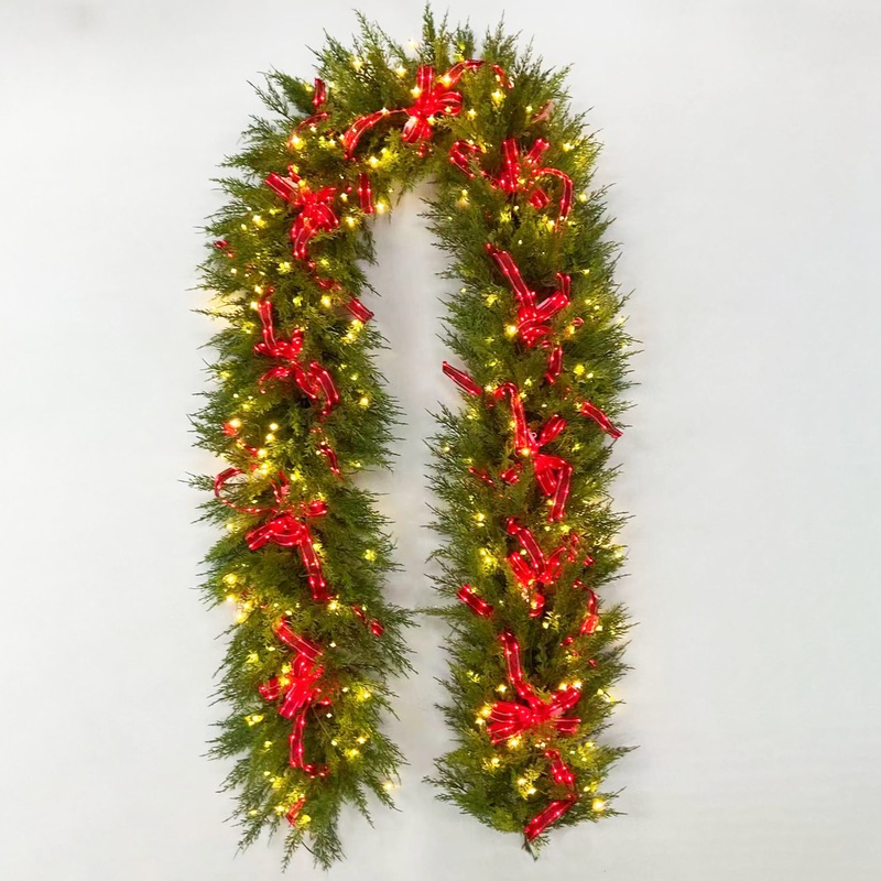 Cedar Pine Garland 9′ with 10 Red Illuma Bow 360 Tip 280 Bulb, Red TW LED