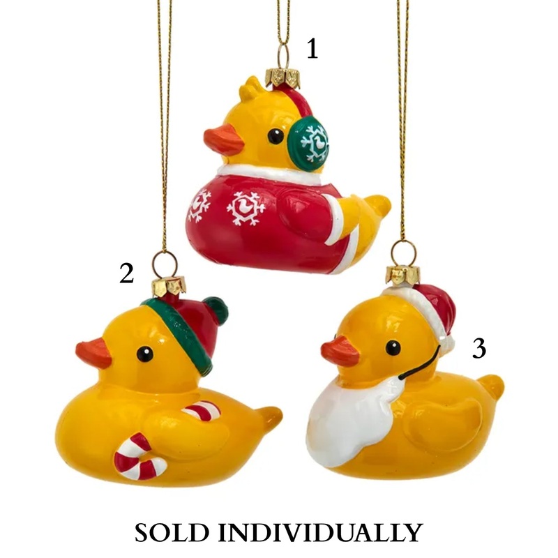 Kurt Adler’s Christmas Rubber Duck Ornaments bring a whimsical and playful touch to your holiday decor. These adorable rubber duckies are dressed in festive Christmas attire, adding a delightful and lighthearted element to your tree trimming. Each rubber duck ornament features a unique holiday theme, in a Santa Claus hat, earmuffs and holding a candy cane, making them a charming trio that adds variety to your decorations. The use of rubber gives these ornaments a cheerful and squeezable quality, making them not only visually appealing but also enjoyable to touch. These ornaments are perfect for bringing a sense of fun and humor to your Christmas tree, especially for families with children or those who appreciate a touch of the unconventional in their holiday decor. These Christmas Rubber Duck Ornaments are also great for adding a festive and whimsical touch to wreaths, garlands, or even as playful additions to holiday gift packages. With their vibrant colors and festive designs, these rubber duck ornaments embody the joyous spirit of the season in a unique and charming way. Whether you’re a rubber duck enthusiast or simply looking to infuse your holiday decor with a bit of quirkiness, these Christmas Rubber Duck Ornaments are sure to make a splash in your festive celebrations.