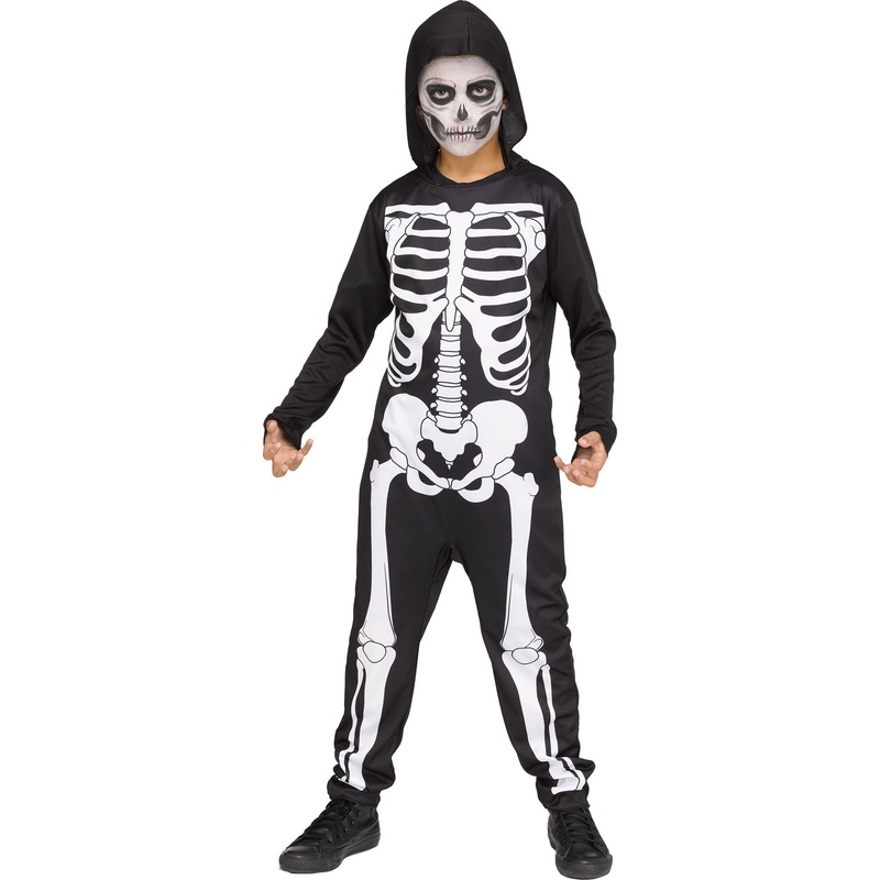Combinaison en poly tricot une pice avec une impression squelette blanche sur le devant et une capuche noire. Ouverture facile dans le dos grce des pattes auto-agrippantes.