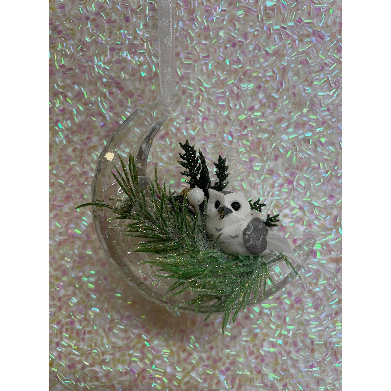 Whimsical and Charming. This crystal crescent moon ornament features an owl nestled in glittered, twinkling greenery. A dazzling addition that will catch the light and add a touch of glimmer to any tree this holiday season!