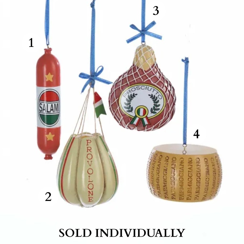 These deli food ornaments from Kurt Adler are a unique addition to your home or store dcor! This assortment features ornaments of prosciutto, provolone, salami and Parmigianino. Although they look delicious, these are for decorative use only!Available in 4