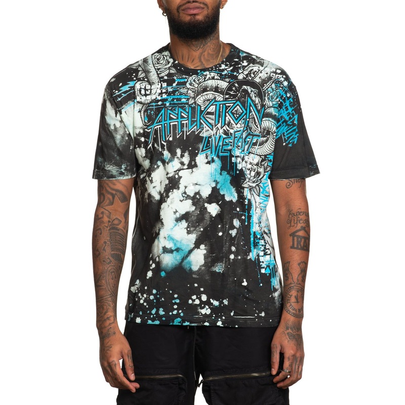 Affliction Men's Electric Asylum Short Sleeve Crew Neck100% CottonMarlin WashEnzyme Silicone Wash After Belt PrintAntique Pyramid Studs On Front + BlackModel is wearing size Large