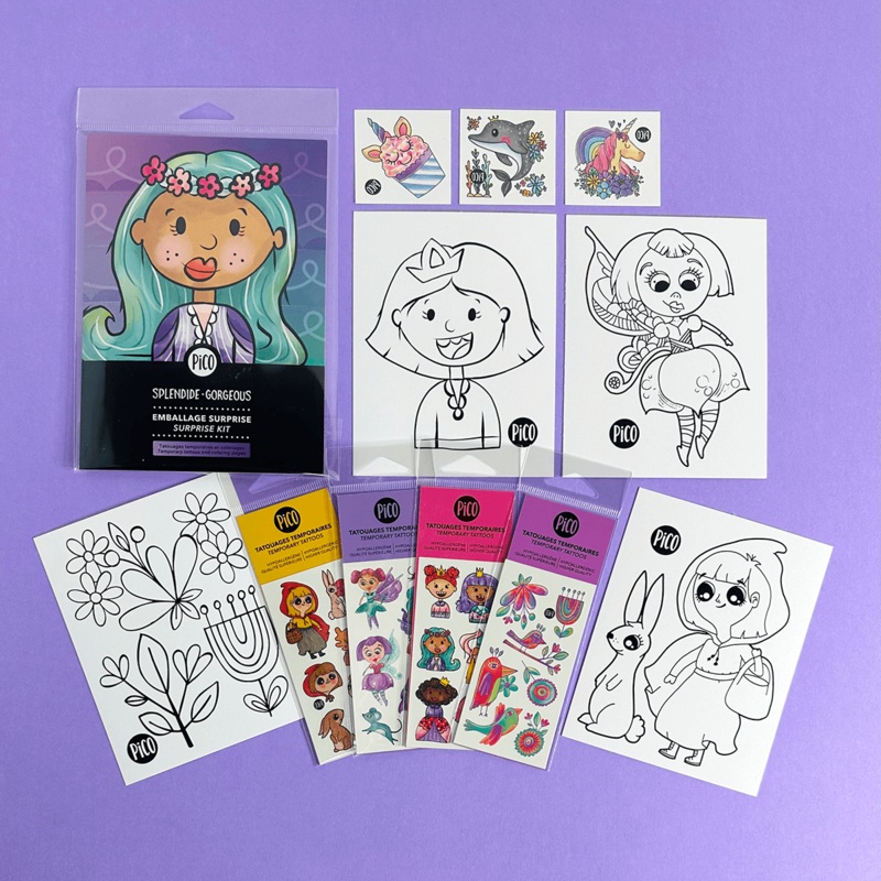 L'ensemble surprise Splendide saura plaire vos petits cocos. L'emballage surprise est idal pour vos ftes damis ou simplement pour amuser vos enfants.Cet ensemble comprend :4 Feuilles de tatouages temporaires de format 2"x4"3 Tatouages temporaires de format
