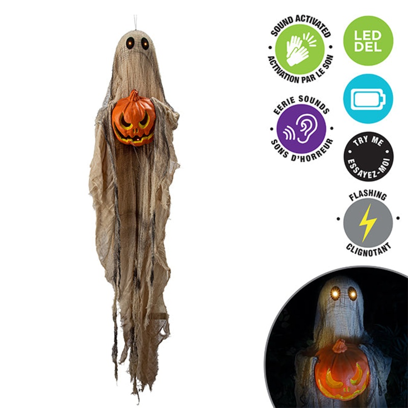 Fantme lumineux suspendu tenant une citrouille lumineuse
