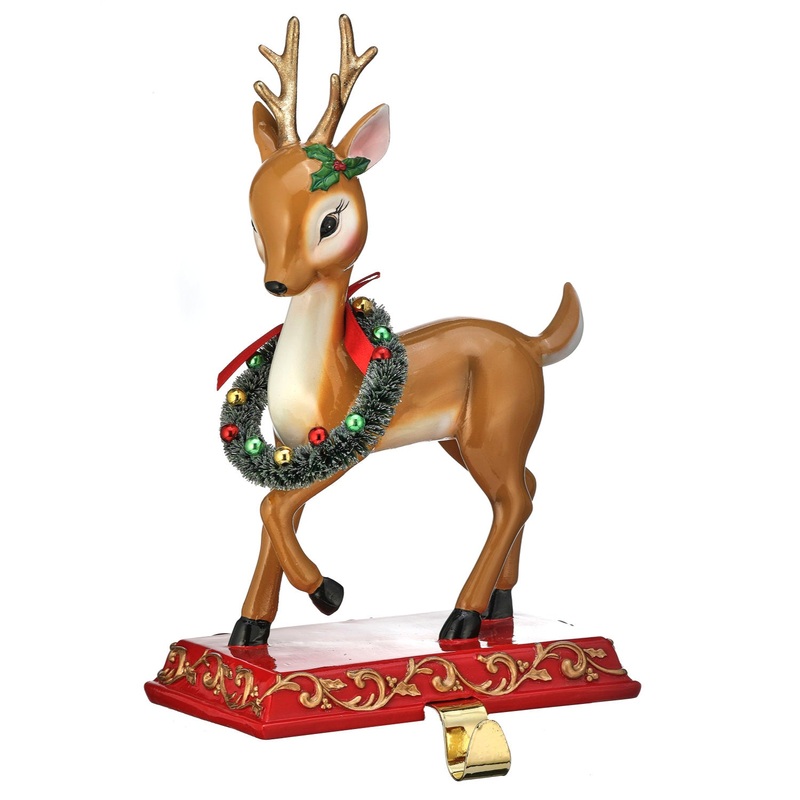 The "Festive Deer Stocking Holder with Wreath and Holiday Accents, 11.5"" features a charming deer adorned with a holiday wreath and vibrant accents, perfect for securely holding your stockings by the fireplace.