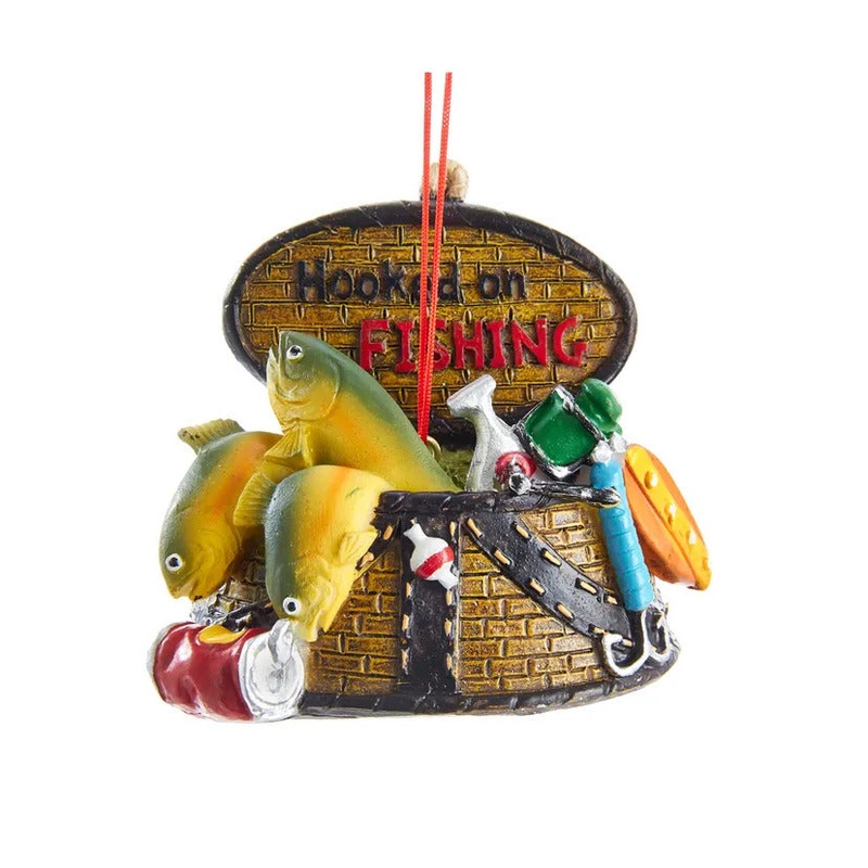 This "Hooked On Fishing" fishing basket ornament from Kurt Adler is a fun and festive addition to your holiday dcor or Christmas tree. It features a basketful of fish, lures, bobbers, bobbins and bait!Made of resinHangs from red string