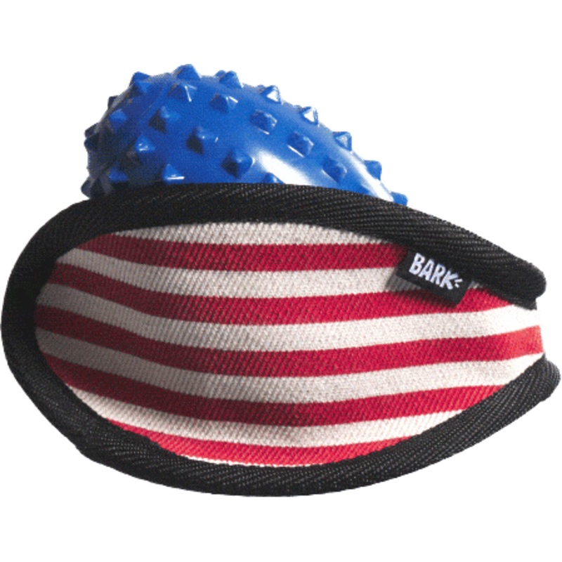 Theres no penalty when you throw this flag-covered football, perfect for fetch. The reinforced fabric can go long while your dog represents the red, white, and chew, eventually uncovering a second football toy inside!Size: Small: 2.75'' L x 4.75" W x 2.75'
