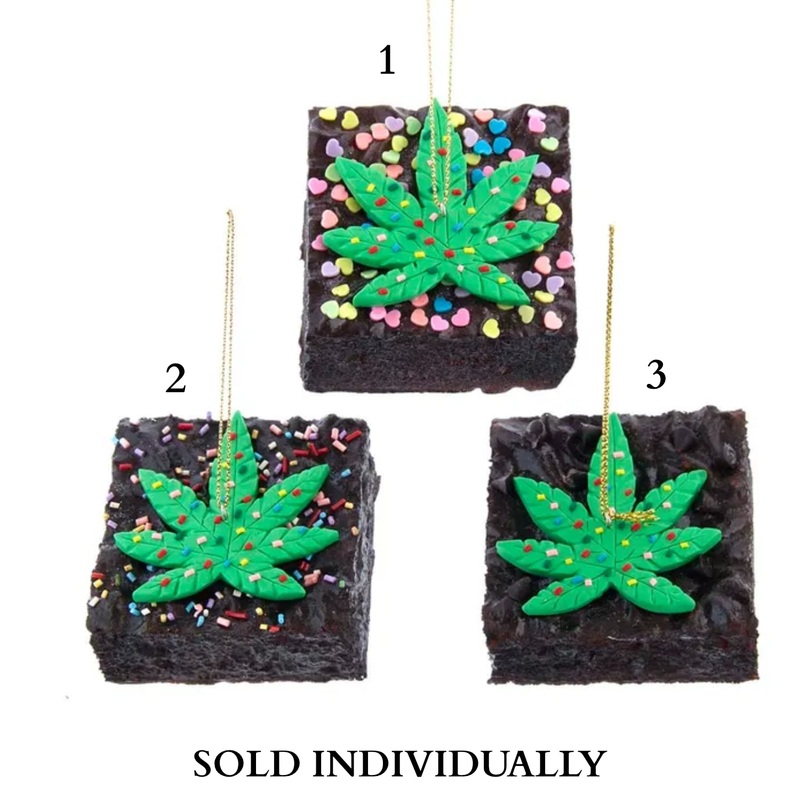 These cannabis brownie ornaments from Kurt Adler are a fun ad unique addition to your holiday dcor or Christmas tree. Included in this assortment are three brownie ornaments decorated with a green cannabis leaf. Each brownie has multicolor sprinkles, choco