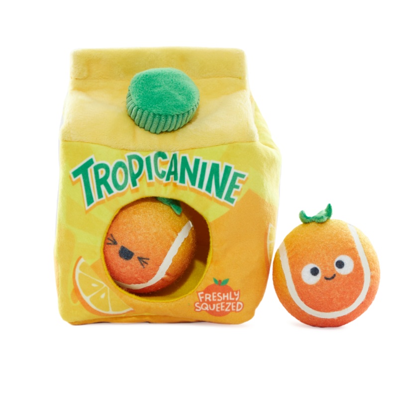 This orange juice dog toy is ripe for the playtime picking. Fresh Squeaked OJ has two squeaky tennis balls that make fetch especially adorable. The plush carton is packed with Vitamin C (that stands for crazy crinkle) and vitamin squeak! Hide some treats i
