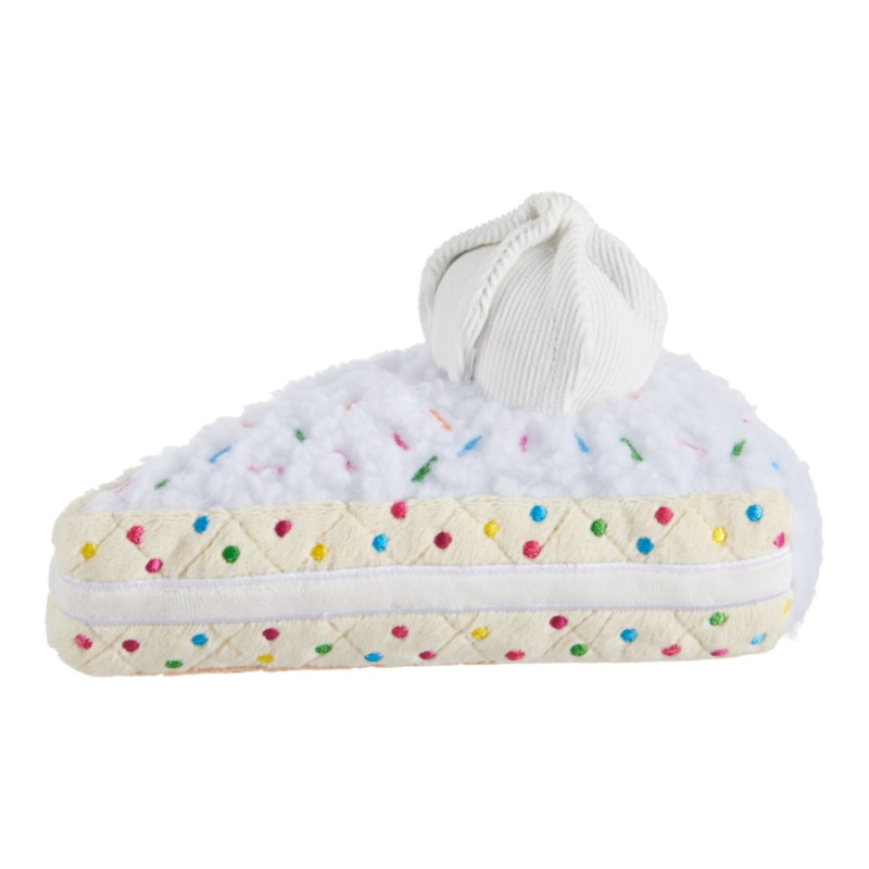 A triangle base squeaker produces a very satisfying sound, plus there is a secret hidden squeaker in the adorable dollop of frosting. Small Size: 4.2"H x 4.5"W x 6.5"LMedium/Large Size: 7.87D x 5.1"W x 4"HFeatures: Squeakers Material Medley Packed with Flu