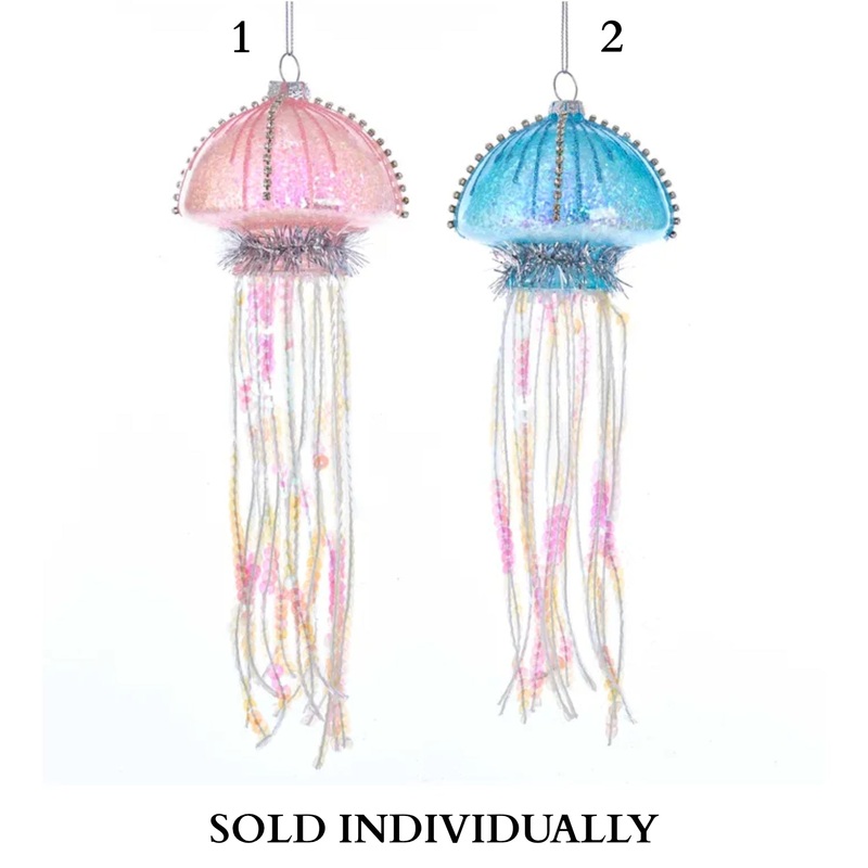 These glass jellyfish ornaments from Kurt Adler are a whimsical addition to any home or holiday dcor. Each glass jellyfish has silver tinsel accents and sequined tentacles.Available in 2 styles Sold individually