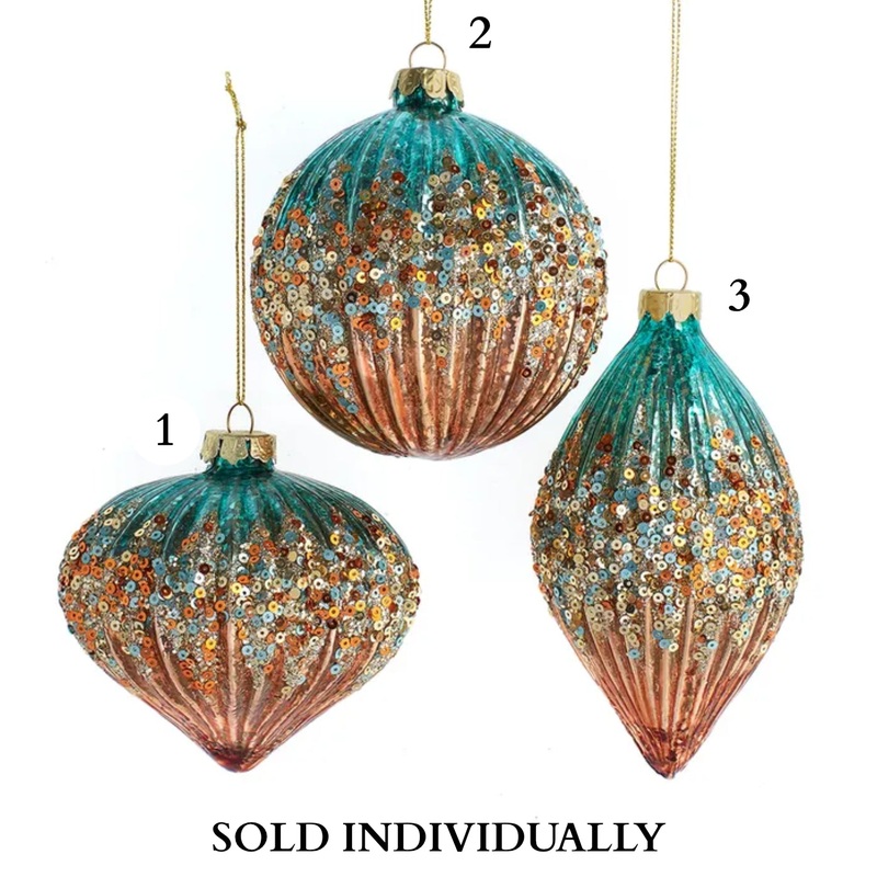 These Glass Ombr Teal & Desert Rose Ball, Drop & Onion Ornaments from Kurt Adler are exquisite decorative ornaments designed to elevate your holiday decor to a whole new level. Crafted with meticulous attention to detail, these ornaments boast a harmonious blend of two captivating colors, teal and desert rose, which create a stunning ombr effect that is both modern and elegant. Included in this assortment are three distinct ornament shapes: balls, drops, and onions, offering a delightful variety that adds depth and visual interest to your holiday tree or any festive setting. The ornaments are made from high-quality glass, ensuring their durability and a luxurious, glossy finish that catches the light beautifully. The teal and desert rose colors featured in these ornaments evoke a sense of sophistication and tranquility. The ombr effect, transitioning from the rich teal to the soft, warm desert rose, creates a captivating visual gradient that is both soothing and visually striking. Elevate your holiday season with these enchanting ornaments that combine the timeless charm of glass craftsmanship with a refreshing ombr color scheme, adding a touch of magic and elegance to your festive celebrations.