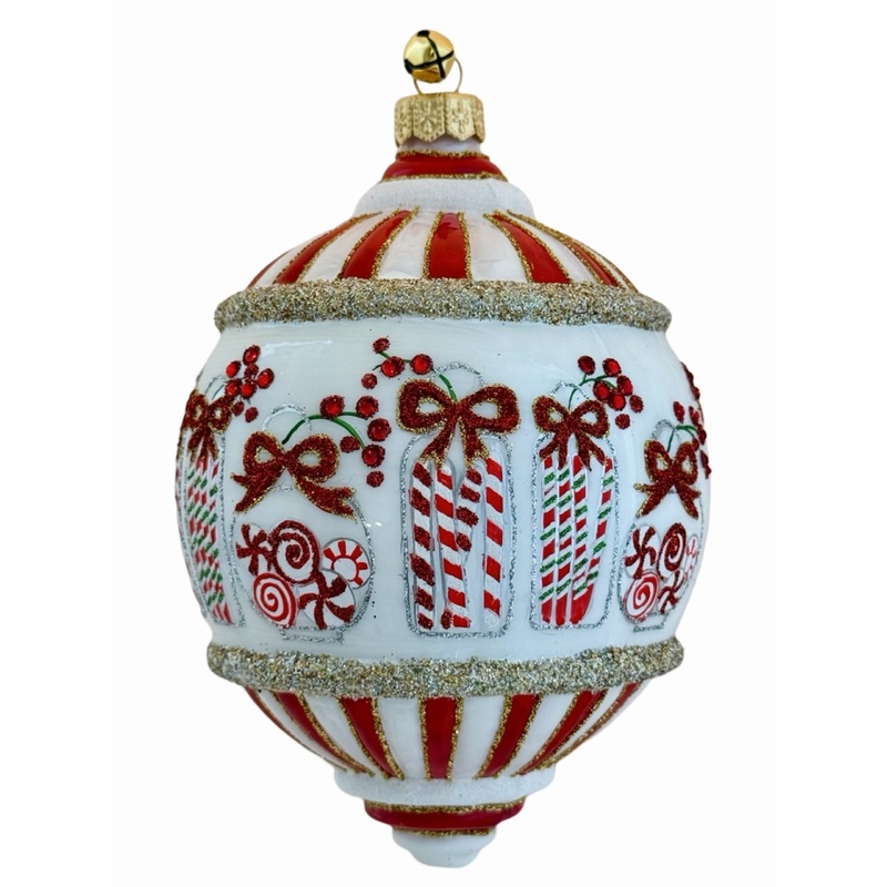 Delight in holiday sweetness with the Glass Peppermint Candy Holiday Sweets Ball Ornament. This 6" hand blown and hand painted glass decoration features whimsical red and white peppermint stripes and festive candy jars filled with peppermint sticks and min