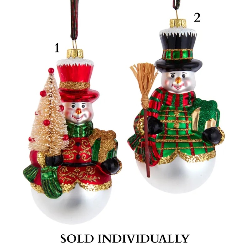 Kurt Adler's glass snowman ornaments are a fun and festive addition to any holiday dcor or Christmas tree. Included in this assortment are a snowman wearing a red jacket with gold glittered accents, in one hand he is carrying a miniature bottle brush Chris