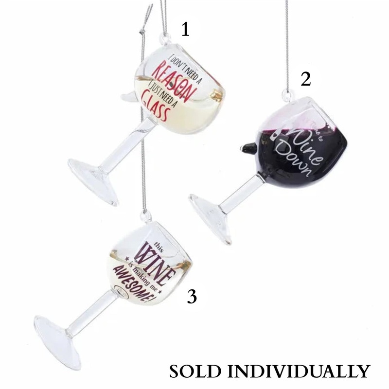 Toast the season with Kurt Adler's glass wine glass ornaments. Each wine glass in this assortment has one of the following saying "I Don't Need A Reason I Just Need A Glass," " This Wine Is Making Me Awesome" and "It's Time To Wine Down."Available in 3 sty