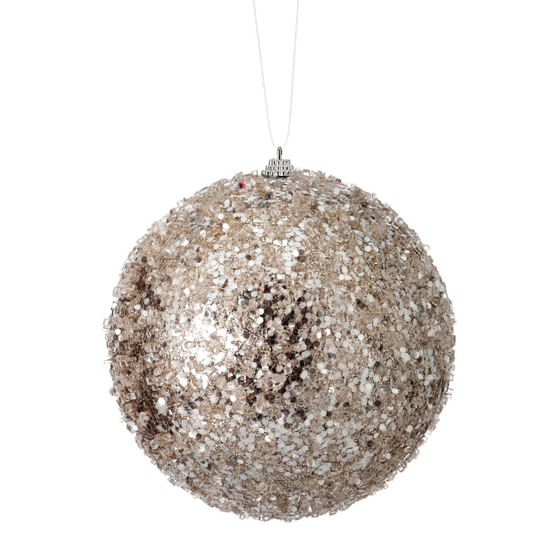 The "Glitter Sequin Iced Ball Ornament, 6" (Platinum)" features a platinum finish with sparkling glitter and sequins for a shimmering effect. Ideal for adding a touch of elegance to your holiday decor.