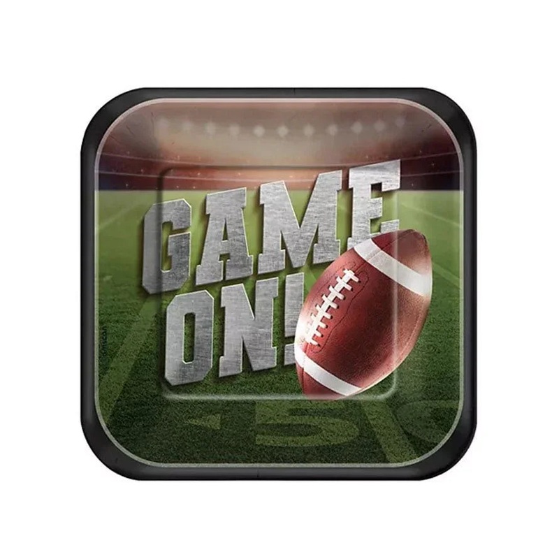 Whether you're serving cake or pigs in a blanket, guests at your viewing party will love the Go Fight Win Football Dessert Plates. These small square paper plates feature a "Game On" headline, plus a realistic football and green turf. Set a stack on the de