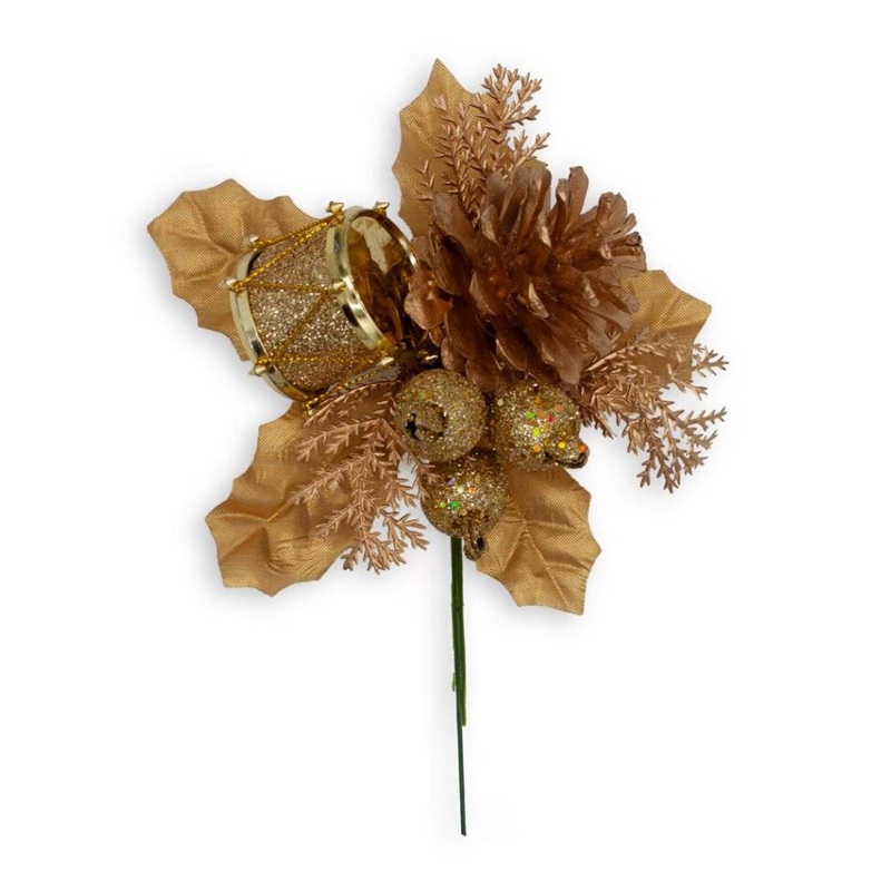 Elevate your holiday decorations with the 7" Gold Glamour Pick. This stunning pick features a gold glitter ball, drum, pinecones and shiny leaves, adding a touch of glamour to your festive displays. With a 4 1/2" stem length and 7" overall length, it's the