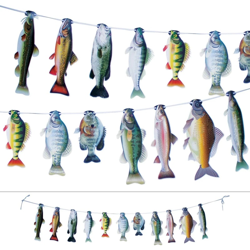 This fun fishing decoration will add a touch of playful charm to any party setup. The banner has a variety of colorful fish hanging on a line with an adjustment length of 4ft to 7feet long. The largest fish on the line is 16.5".Includes:1 x large fish bann