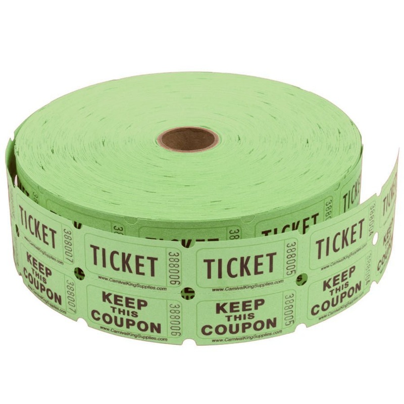 Thisticketroll contains 2,000doubleGreen tickets. Double tickets allow you to keep on and your guest to keep another. Thay way you both have proof of payment andwhich number the ticket was purchased.Thetickets are attached by easy tear perforations on each end. Identical individual numbers are printed on each ticket pair.The back ofthe guestticket is left blank and the back of your ticket has prompts for getting your guest’s name, address, and phone #. the color is bright is easy to read bold lettering. These tickets are great for events with giveaways, raffles, and more.