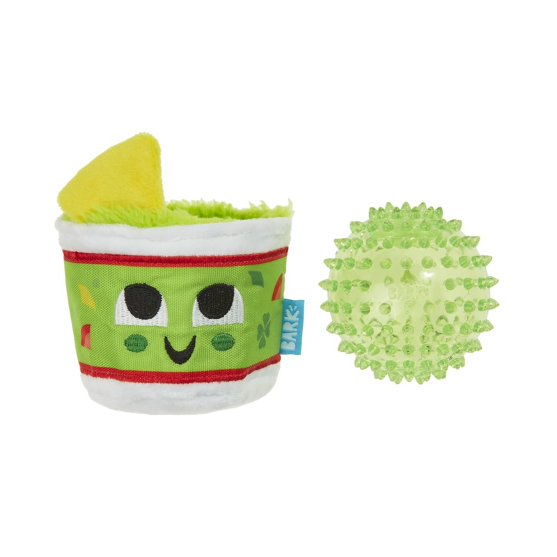 Who are you callin mild?! Guac-A-Molly has a spiky ball squeaker to get playtime guac-in & rollin. Hide a treat in the crinkle cup to reward your dog for double dipping.Medium/Large Size: 3.23D x 3.55W x 4.53H Features: Multi-Part Toy (2, Friction Fit) 2 S