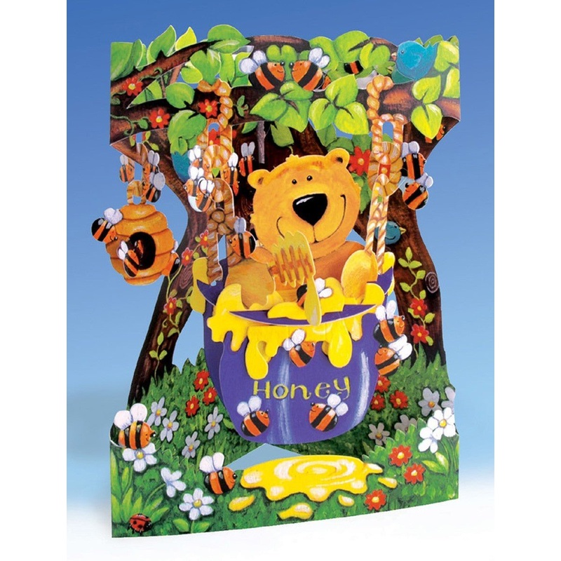 This blank card features a 3-D, interactive bear with a big pot of honey and surrounded by bees. Already assembled and unique, this card with matching envelope is perfect for birthdays and other occasions. Includes 1 greeting card.