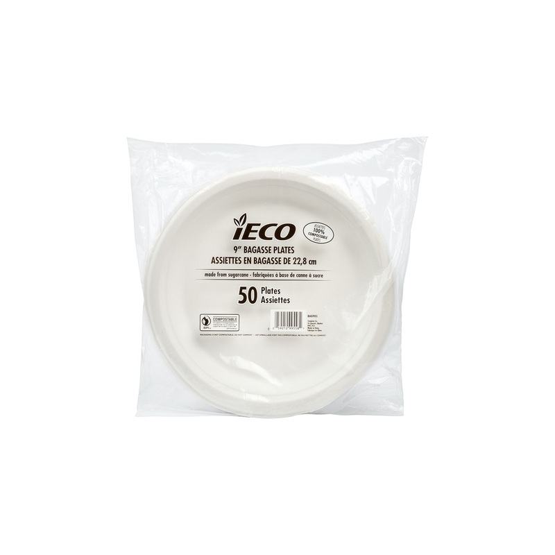 iECO 50 Round Compostable White Bagasse Plates 9in