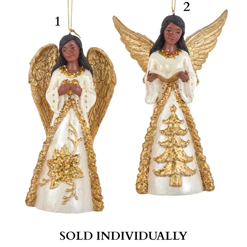 These African American ivory & gold Angel ornaments from Kurt Adler are a festive addition to any holiday dcor or Christmas tree. Wearing a white dress with gold glittered trim, one angel is holding a gold glittered heart with a glittered poinsettia on her