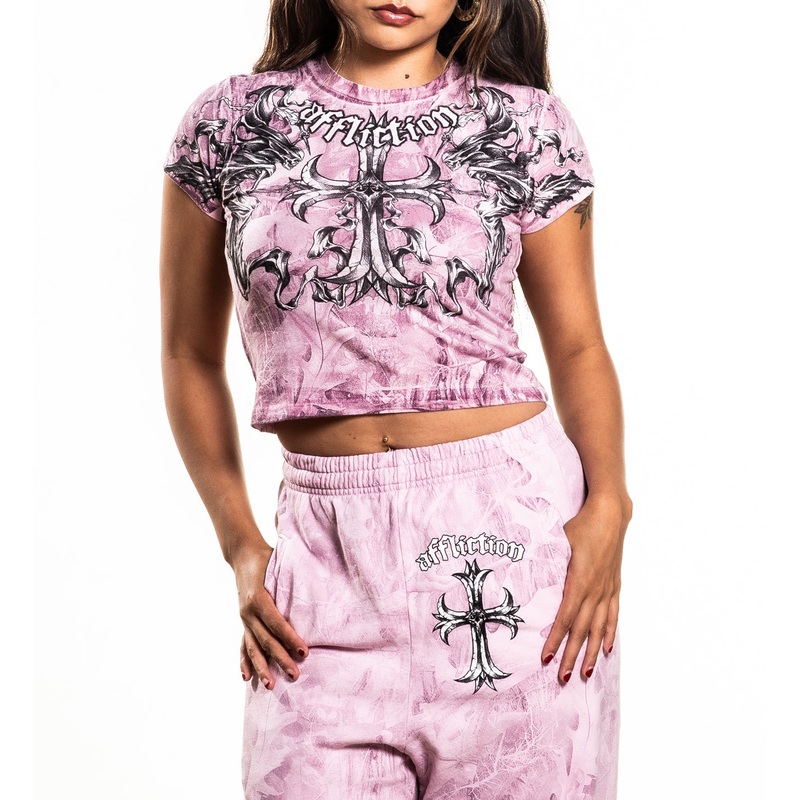 Affliction Womens Jump Short Sleeve Crew Neck Tee100% CottonLight PinkEnzyme Silicone Wash After PrintModel is wearing size Small