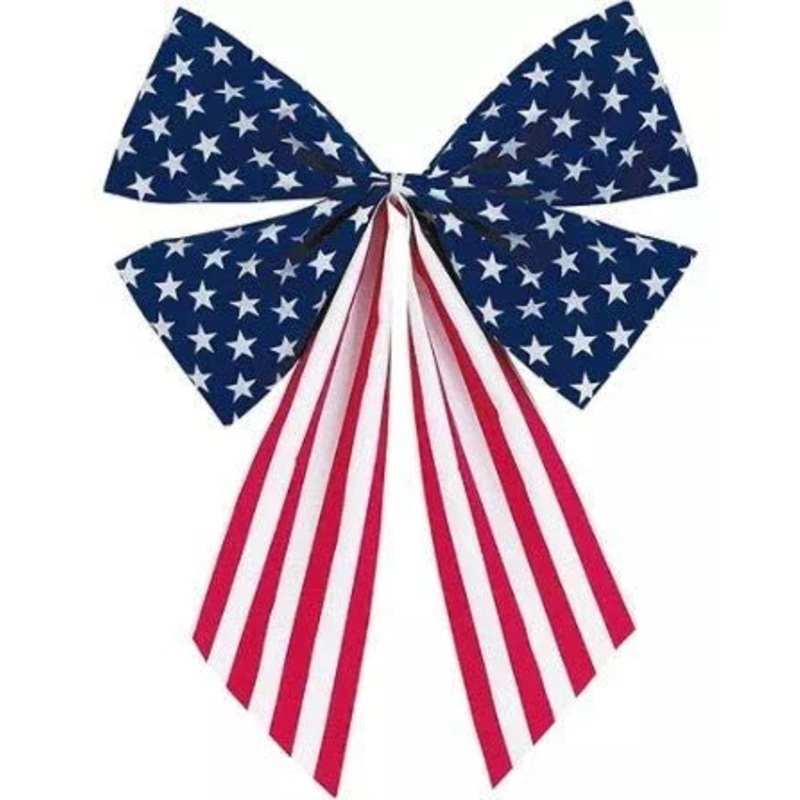 Show your patriotic spirit throughout the year with a decorative Patriotic American Flag Bow. It features a blue four-loop bow with white stars and red and white striped pleats. This red, white, and blue fabric bow makes a great decoration for any patrioti