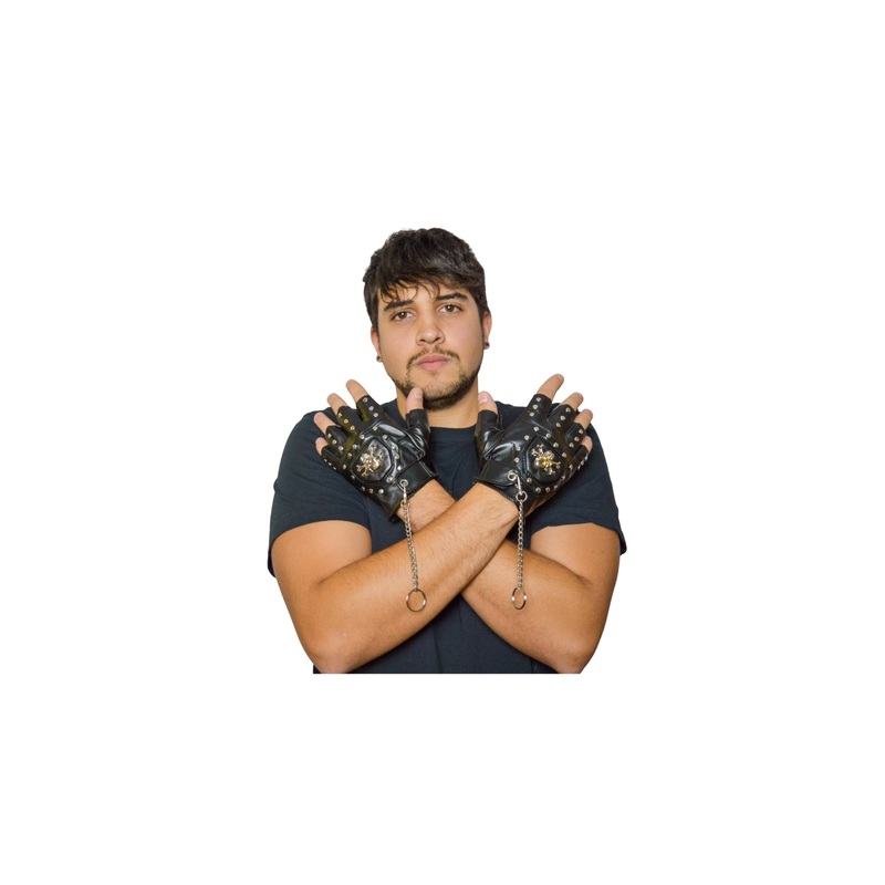 Velcro closure faux leather fingerless gloves with silver metal chain and skull detailing.