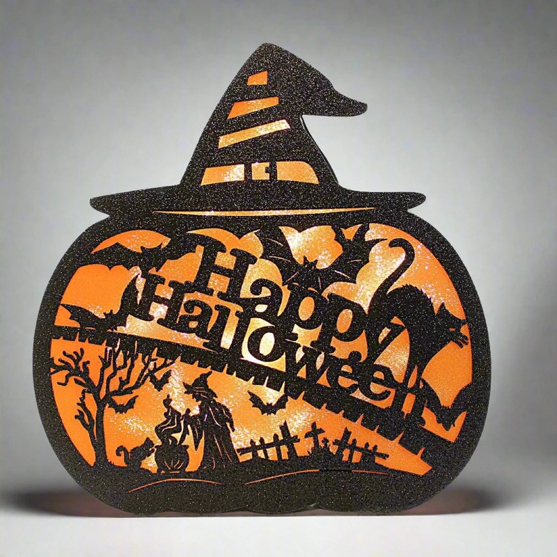 Transform your Halloween decor with our Lighted Happy Halloween Pumpkin Figure! This 13" pumpkin figure is sure to add a spooky yet inviting ambiance to your home. Its laser cut front scene adds a unique touch that complements its eerie style.3 AAA BATTERI