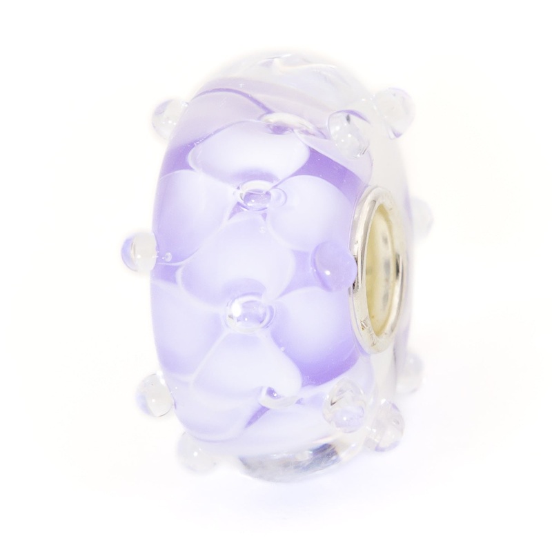 White petals of Lilac Perpetuals are floating on the base of subtle lavender color covered with a transparent layer of glass. The bead has raised dots on the sides.