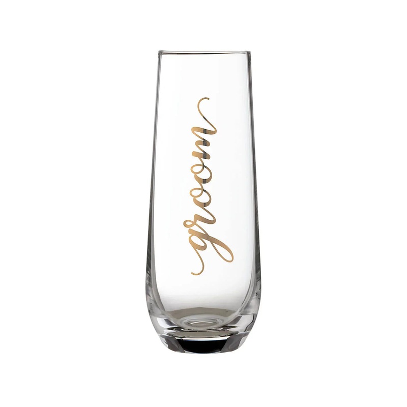 Be prepared for wedding day toasts with this elegant stemless champagne glass for the groom. Not only is this perfect for wedding reception toasts, it is a great keepsake for the groom from his wedding day. Holds 8 oz.z.