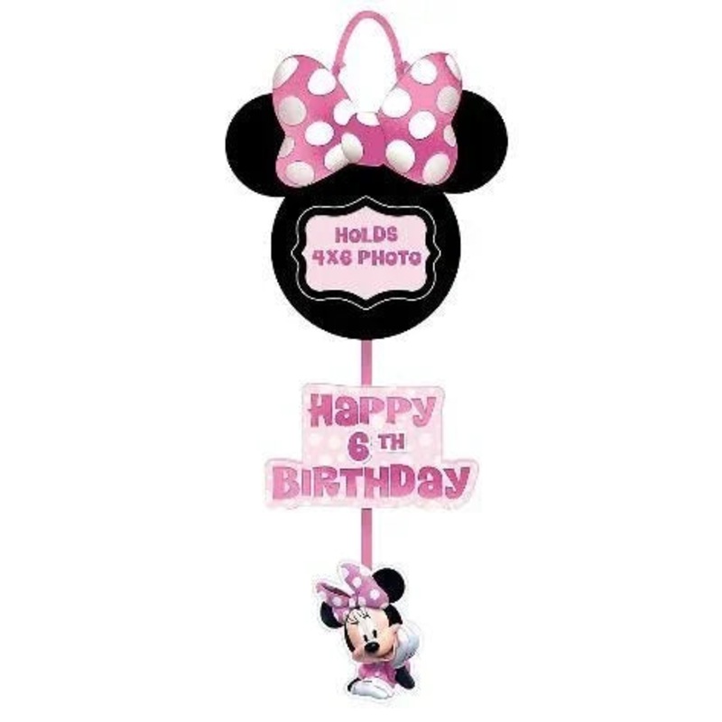Add a personal touch to your pink and black Disney party decorations with a Minnie Mouse Forever Personalized Birthday Photo Sign. The sign hangs from the wall and features a large black Minnie silhouette that you can add a 4in x 6in photo to. Below is a "