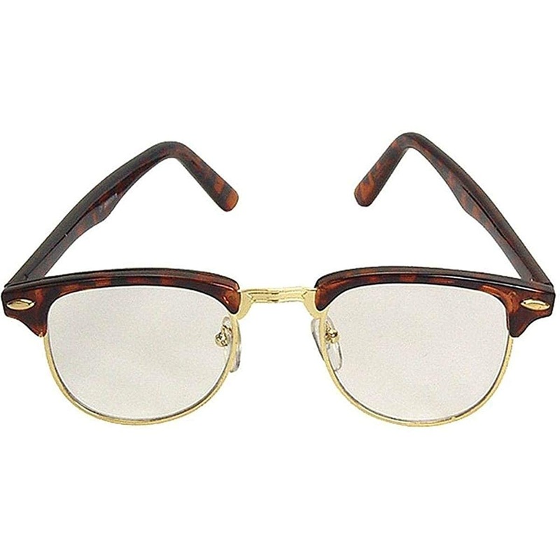 Classic 50's styalized tortiose shell and gold rim glasses with clear lenses. For Novelty use only, does not provide UV protection.