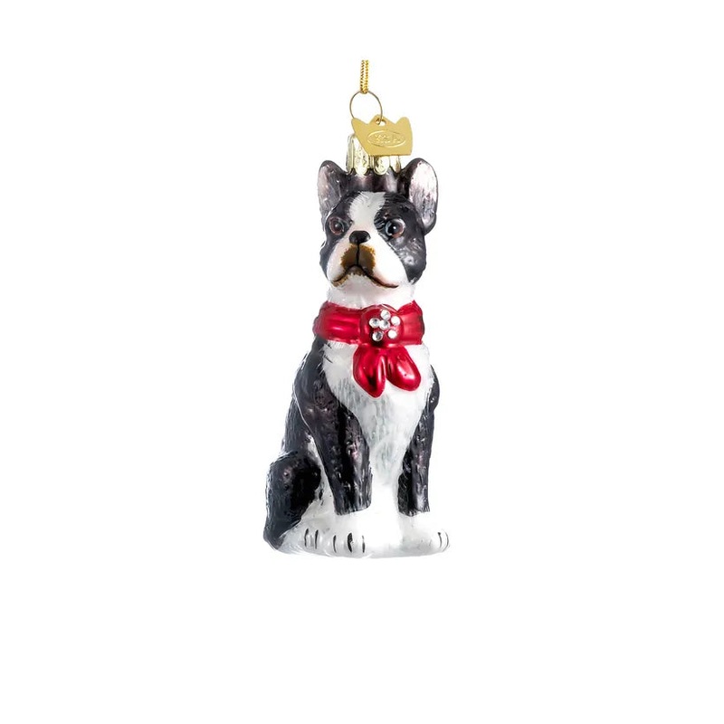 This Noble Gems Boston Terrier ornament from Kurt Adler is a charming way to remember man's best friend this holiday season! This ornament features a black and white Boston Terrier wearing a festive red scarf with rhinestone accents.