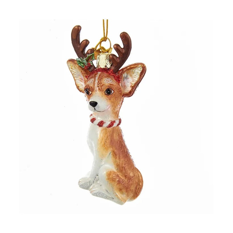 This Noble Gems glass Chihuahua with antlers ornament is a loveable addition to your holiday or home dcor. This ornament is displayed in light brown and white fur. ornament includes red and red and white striped collar. The Chihuahua is featured wearing br