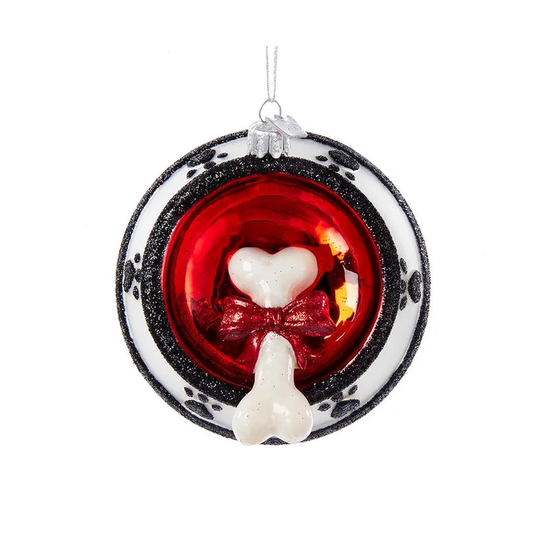 This Kurt Adler Noble Gems dog bone in bowl ornament is a beautiful addition to any holiday decor or Christmas tree. This ornament features a white dog bowl with black glitter accents with a dog bone wrapped in a bright red ribbon resting in the bowl.