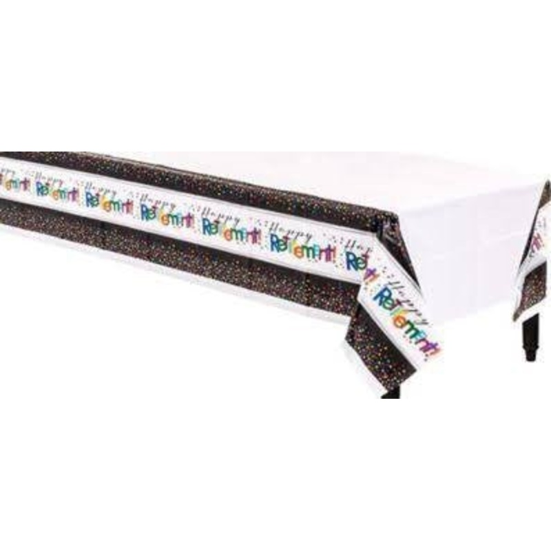 Protect your party table with this 52'' x 98'' plastic table cloth. This easy way to decorate your buffet table is rainbow multicolored polka dots on a black background and commands you to relax and have fun as you sail off into retirement.