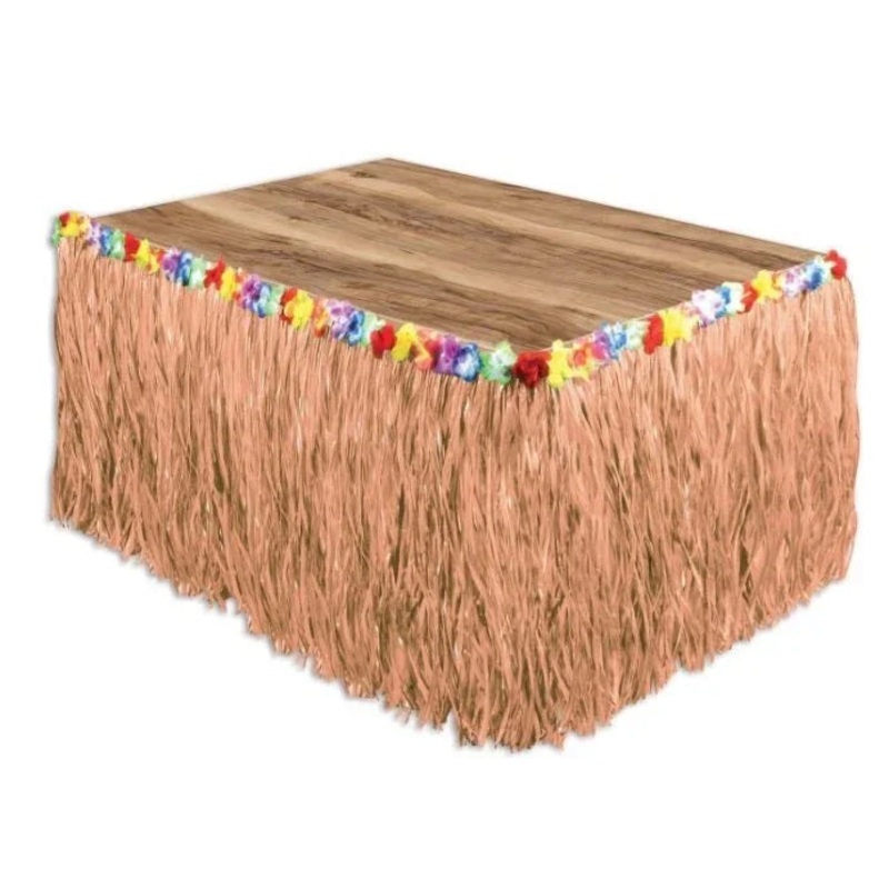 It's grass skirts and hibiscus flowers all around--the table, that is! Dress up the bar, table, and railings with the traditional Hawaiian garb and get in the mood to hula! This 9-foot artificial orange grass table skirting features brightly colored silk h