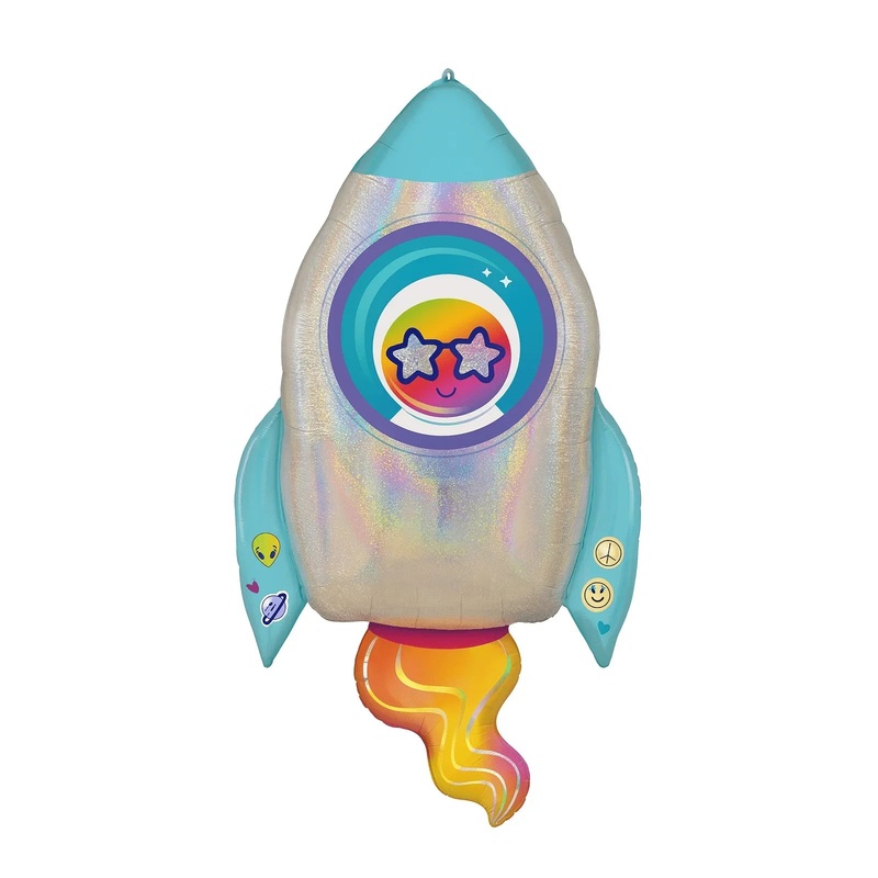 Blast off in style with our dazzling Holographic Rocket Foil Balloon! This extra-large balloon features a shimmering silver rocket body with a fun astronaut face in star-shaped sunglasses, colorful decals on the fins, and a vibrant rainbow flame tail that