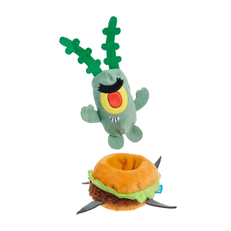The Krabby Patty formula is not the only thing Plankton is after, hes coming straight for your pups treats! Hide treats inside the patty and have your pup sniff out this evil genius.Small Size: 4.75""W x 5.25""D x 8""HFeatures: Multi-Part Toy (2) 2 Squeake